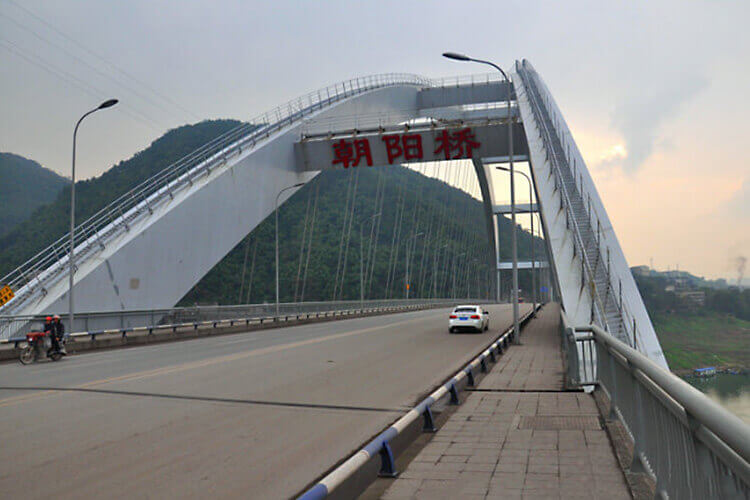 北碚朝阳复建桥,是重庆市重点工程,桥址位于北碚区毛背沱观音峡峡口处,距朝阳吊桥上游100米处,自南向北横跨嘉陵江。该桥主跨结构为274米的钢箱提篮拱,其中拱肋部分58个节段、过渡墩2个节段、拱间横梁6个节段,特殊节段的长度近14米、高8.3米、宽3.2米、重量达92吨。其中,桥梁建设过程中应用了威胜利(VSL)体外预应力体系。